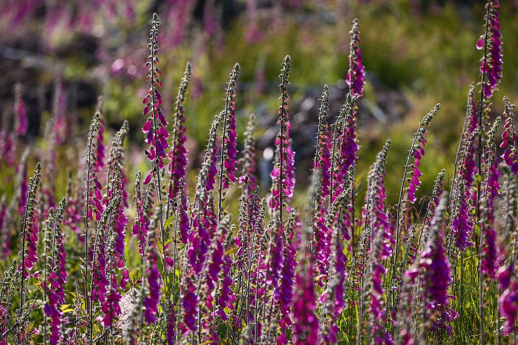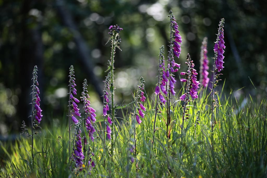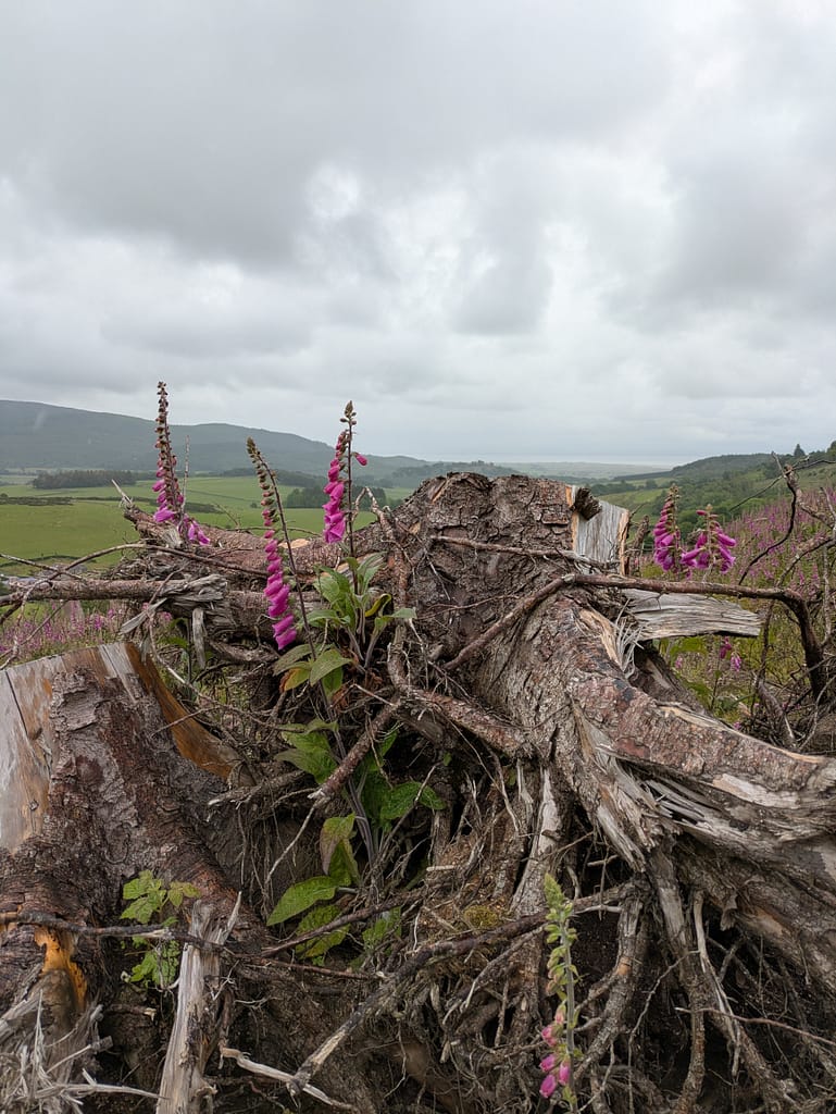 Native to the UK, foxgloves (digitalis purpurea – literally ‘purple fingers’) grow especially well in acid soil, and are often the first wildflowers to appear on recently-felled sites, which would make sense at Bennel due its history as a cleared forestry plantation.
