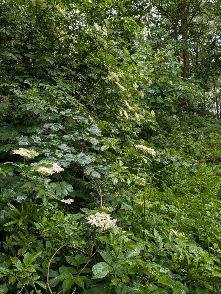 I parked my car by the gate and started to walk along the entranceway, noting the variety of hedgerow plants edging the path. Nettles, cleavers and brambles all vied for position in amongst the various grasses. Some areas were carpeted by ferns, some by buttercups. The trees were all in leaf and a few were flowering, including the lacey mop heads of the elders, just waiting to be picked for fritters or fizz.