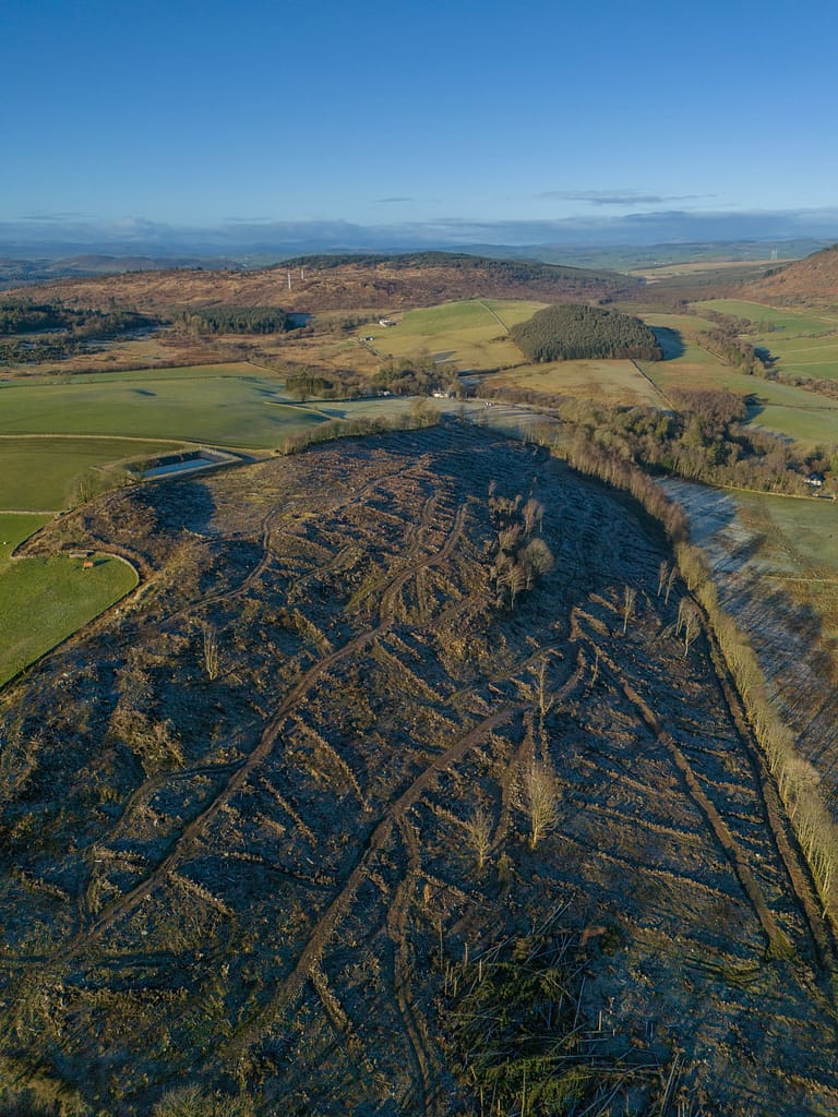 In many places a line of boundary trees remains on the site – a mixture of Sycamore, Beech and others. Work has taken place on the site to form Brash and stumps into windrows, with access tracks formed around the site as part of the harvesting operations.