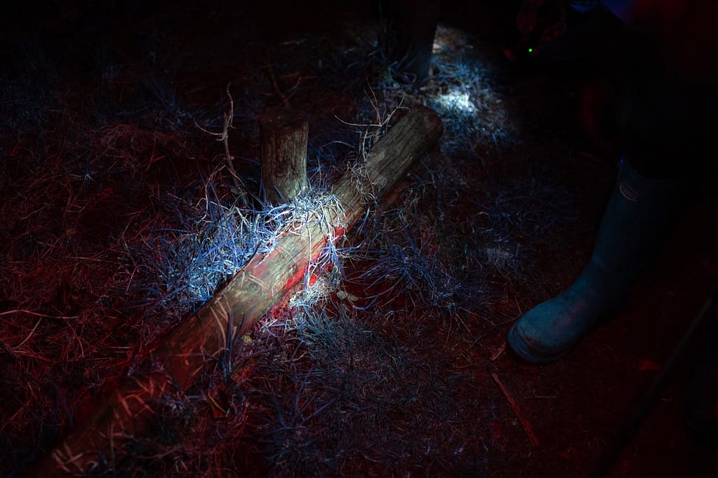 Each attendee was given their own UV torch and the group stepped out into Kirkconnel Flow. Before even leaving the car park, the impact of the Bioflourescence meant half the group were on their hands and knees, investigating the blues of grasses, the reds of choryphyll and the dazzlingly bright white of the normally low-key potworms (also called Enchytraeids).