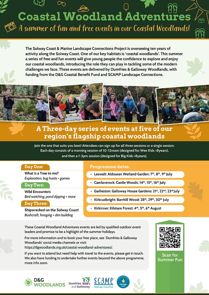The Solway Coast & Marine Landscape Connections Project is overseeing ten years of activity along the Solway Coast. One of our key habitats is ‘coastal woodlands’. This summer a series of free and fun events will give young people the confidence to explore and enjoy our coastal woodlands, introducing the role they can play in tackling some of the modern challenges we face. These events are delivered by Dumfries & Galloway Woodlands, with funding from the D&G Coastal Benefit Fund and SCAMP Landscape Connections. All possible thanks to the support from landowners and host partners across the region.