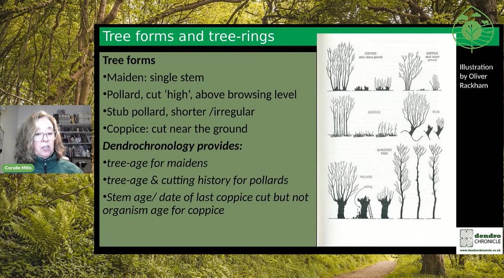 - Dendrochronology: Provides tree age and cutting history i.e. pollarding routine and dates of last coppicing cuts. It can also be used to date timbers in old buildings, to felling year and sometimes to even the season and potentially where the tree was felled.