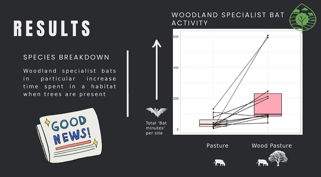 Beth’s PhD study collected audio data of bats in several pastures with and without trees. The study showed a 40% increase in bat activity in pastures with scattered trees compared to pastures with no trees. This is likely because the holes and cracks in old trees are perfect for roosting bats during the day, and they host a plethora of tasty insects, perfect bat prey at night. Beth has now started using thermal cameras to further investigate how bats use landscapes and trees.