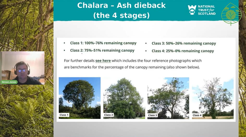 - The progression of Chalara infection in Ash is categorised into 4 classes. Class 1 having most of the canopy remaining to class 4 where 25%-0% of the canopy remains. Tree health can improve slightly sometimes dependant on environmental conditions, but generally the disease only progresses.